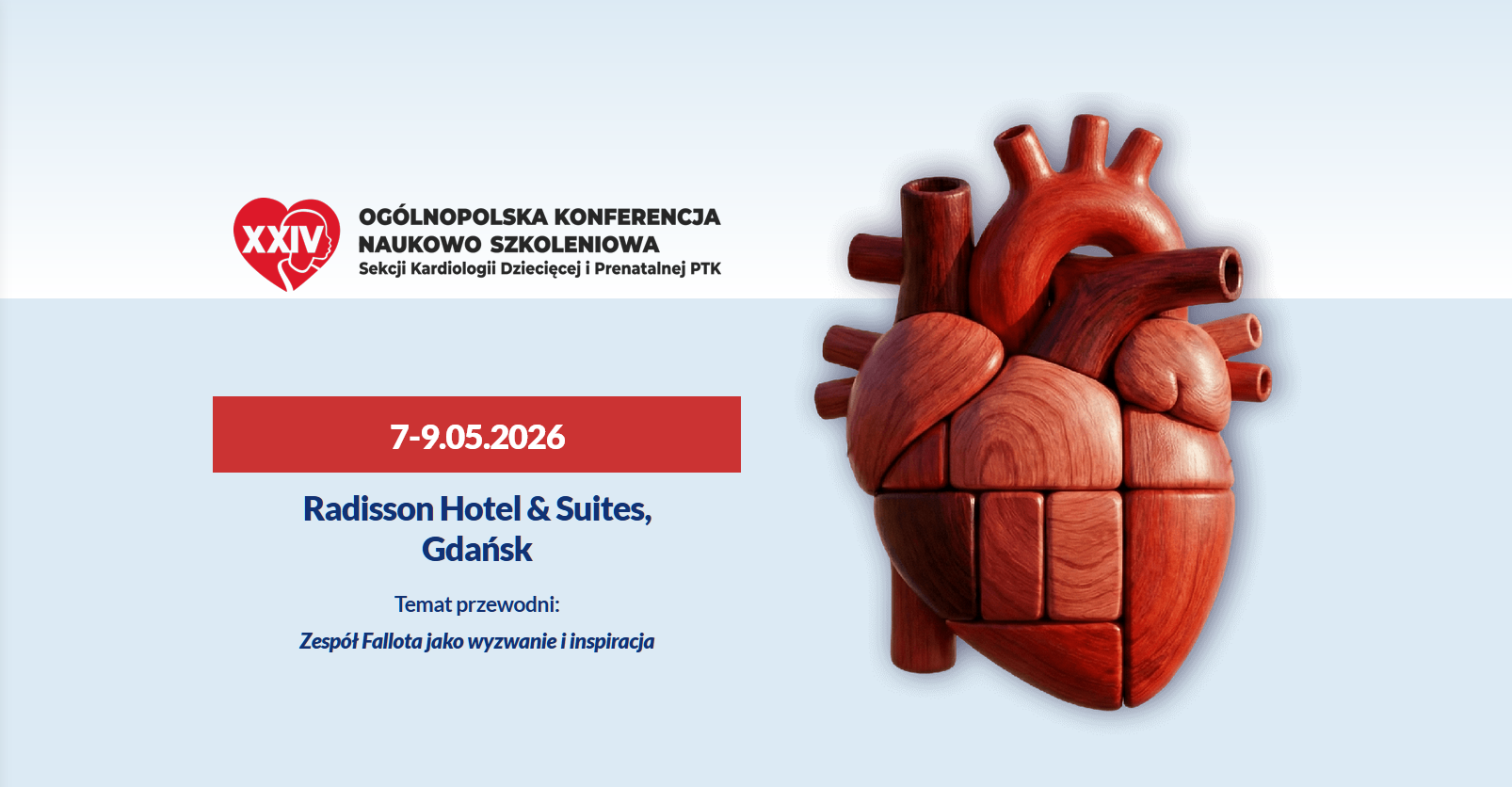 Przekazujemy otrzymane od Przewodniczącego Sekcji p. dr hab. Rolanda Fiszera oraz Przewodniczącej Komitetu Organizacyjnego, Pani prof. dr hab. n. med. Joanny Kwiatkowskiej zaproszenie na XXIV Ogólnopolską Konferencję Sekcji Kardiologii Dziecięcej i Prenatalnej PTK, która odbędzie się w dniach 7-9.05.2026, w Radisson Hotel & Suites w Gdańsku. Tematem przewodnim konferencji będzie: „Zespół Fallota jako wyzwanie i inspiracja”.